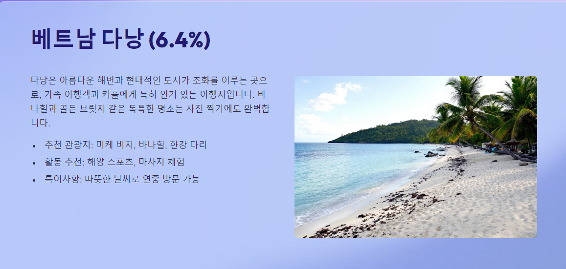 - 추천 관광지: 미케 비치, 바나힐, 한강 다리