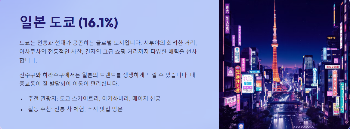 - 추천 관광지: 도쿄 스카이트리, 아키하바라, 메이지 신궁