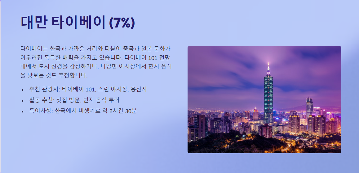 - 추천 관광지: 타이베이 101, 스린 야시장, 용산사