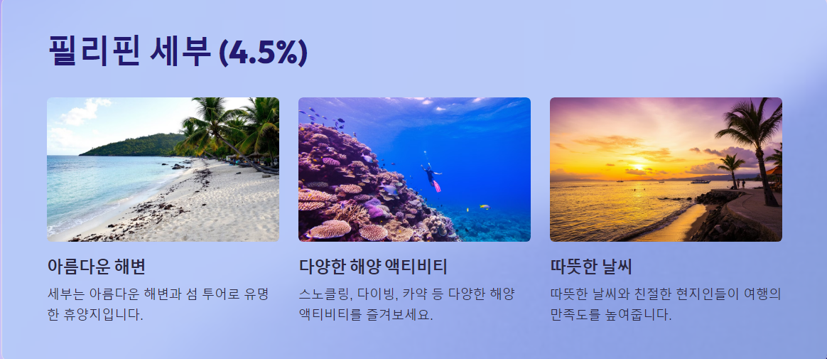 - 활동 추천: 스쿠버다이빙, 섬 호핑