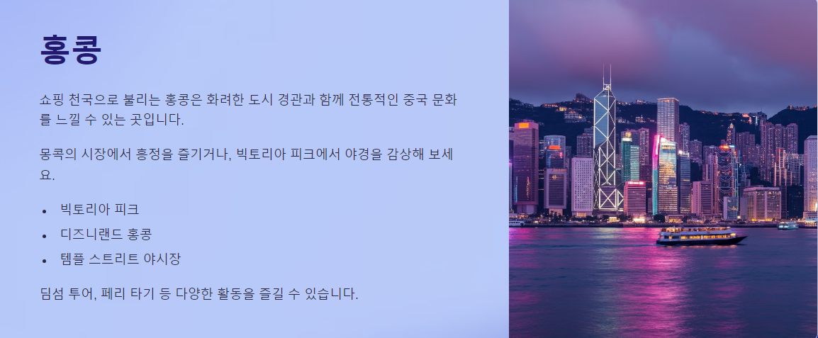 - 추천 관광지: 빅토리아 피크, 디즈니랜드 홍콩, 템플 스트리트 야시장