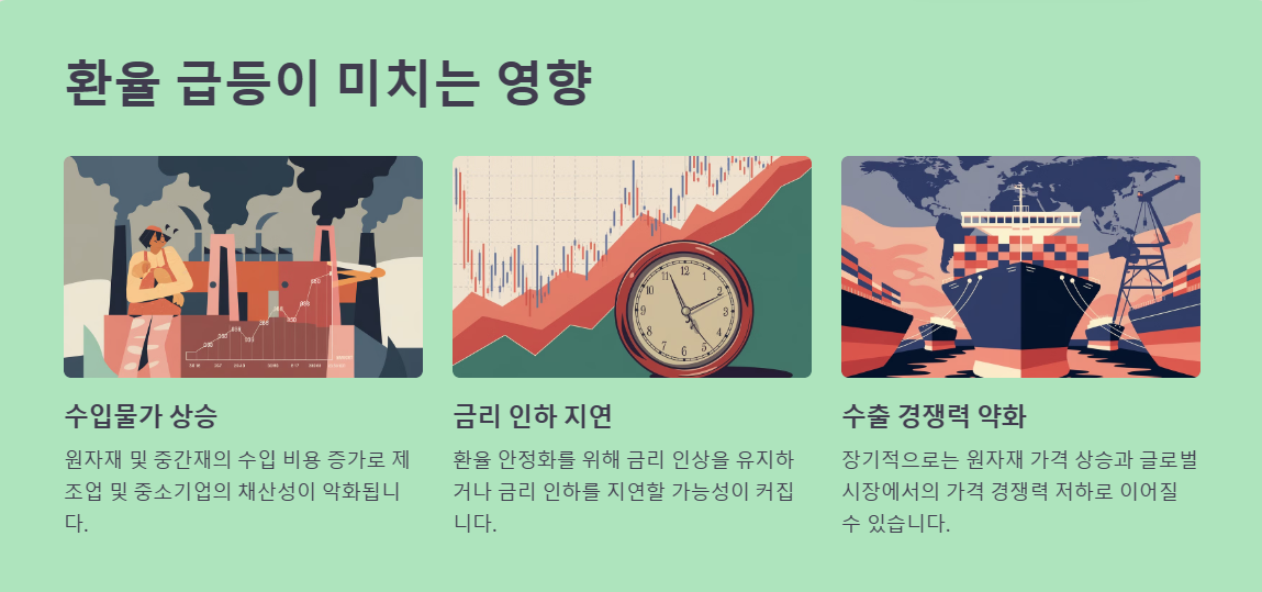 - 환율 급등이 한국 경제에 미치는 가장 큰 영향은 무엇인가요?