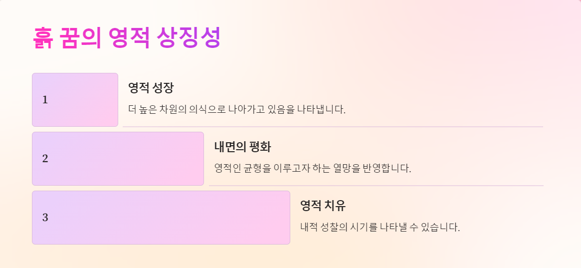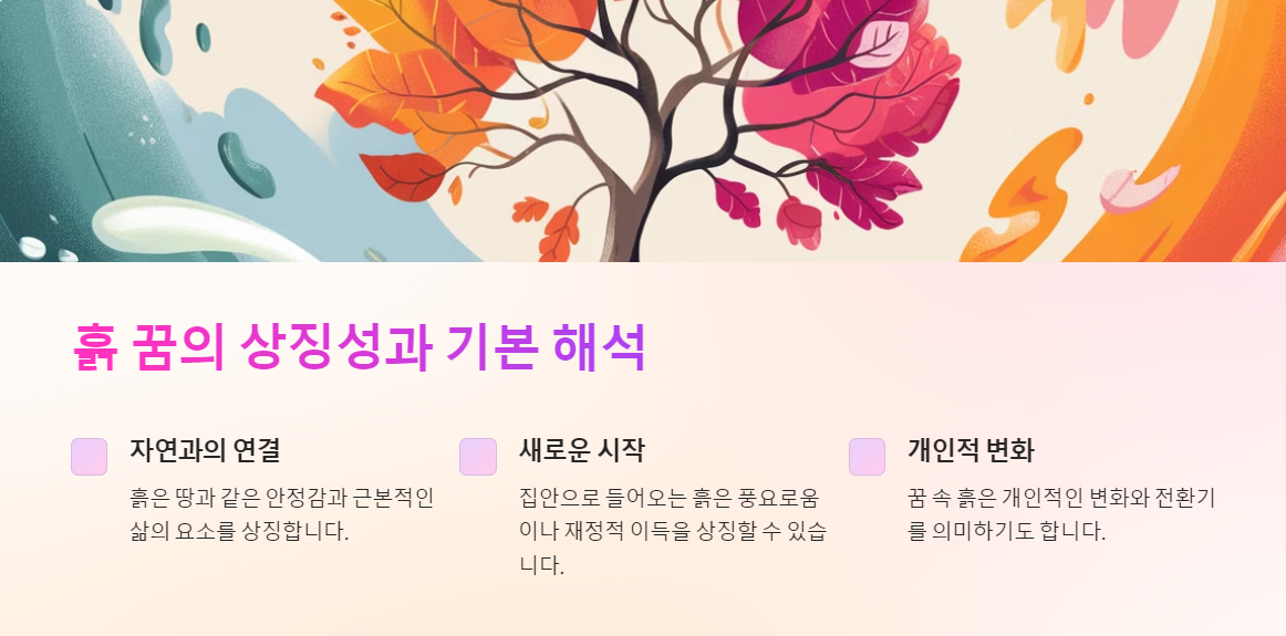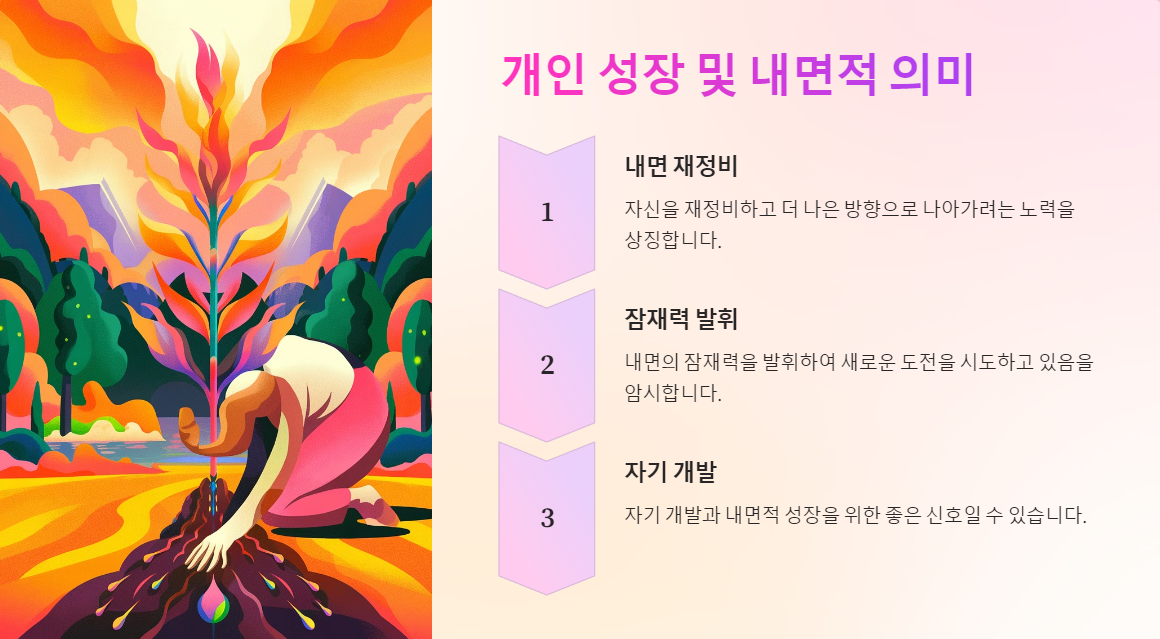 흙은 또한 고난을 극복하고 새로운 기반을 다지는 과정을 나타낼 수 있습니다. 이는 당신의 삶에서 뿌리를 내리고 안정감을 찾고자 하는 내면의 욕망과 연관됩니다. 즉, 흙은 새로운 단계로 나아가는 데 있어 중요한 자원이나 기반을 제공하는 상징으로 볼 수 있습니다.