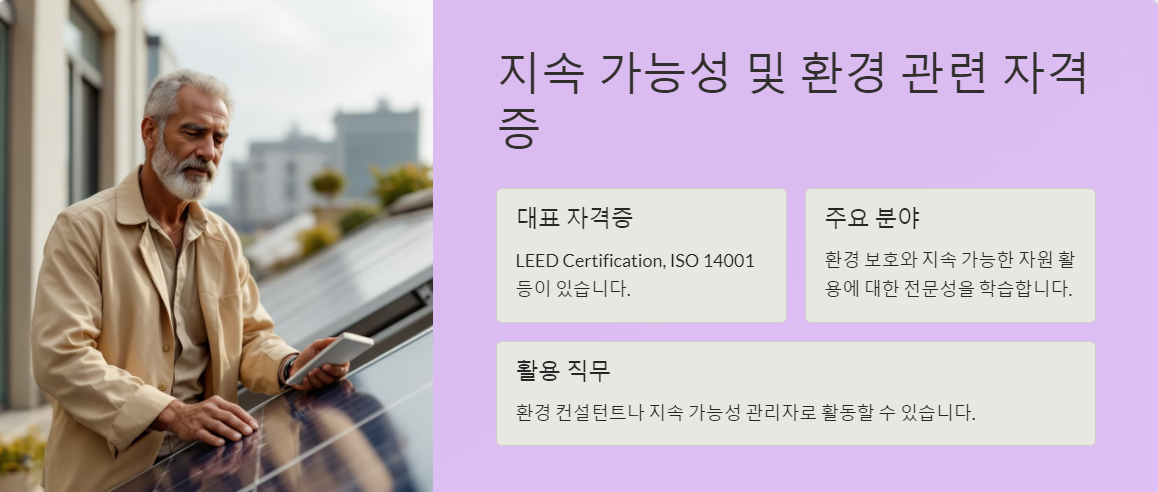 LEED Certification, ISO 14001 등이 대표적인 자격증입니다.