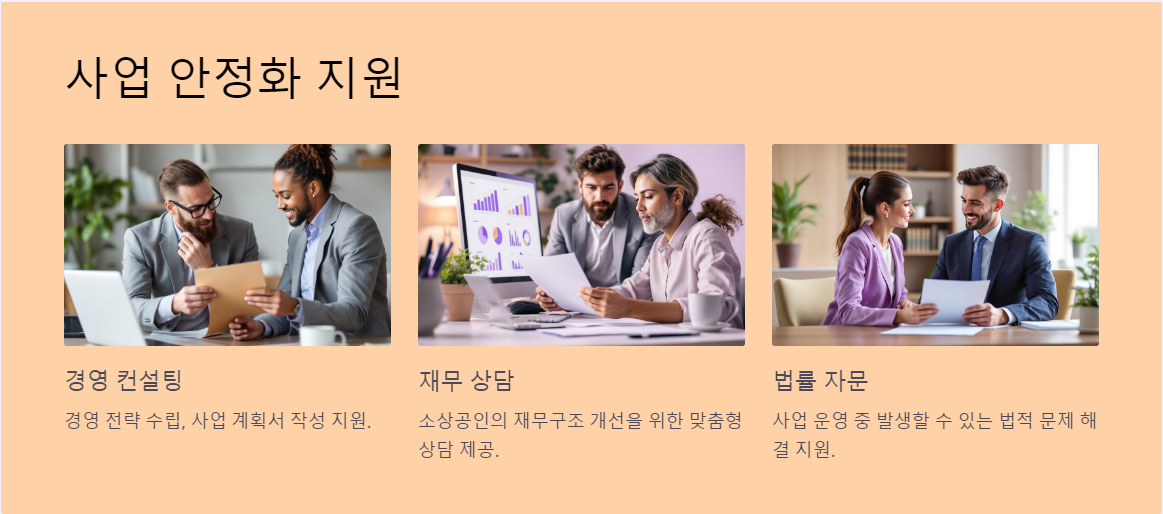 - 전문가 배정: 소상공인 맞춤형 지원을 위한 전문 컨설턴트 제공.