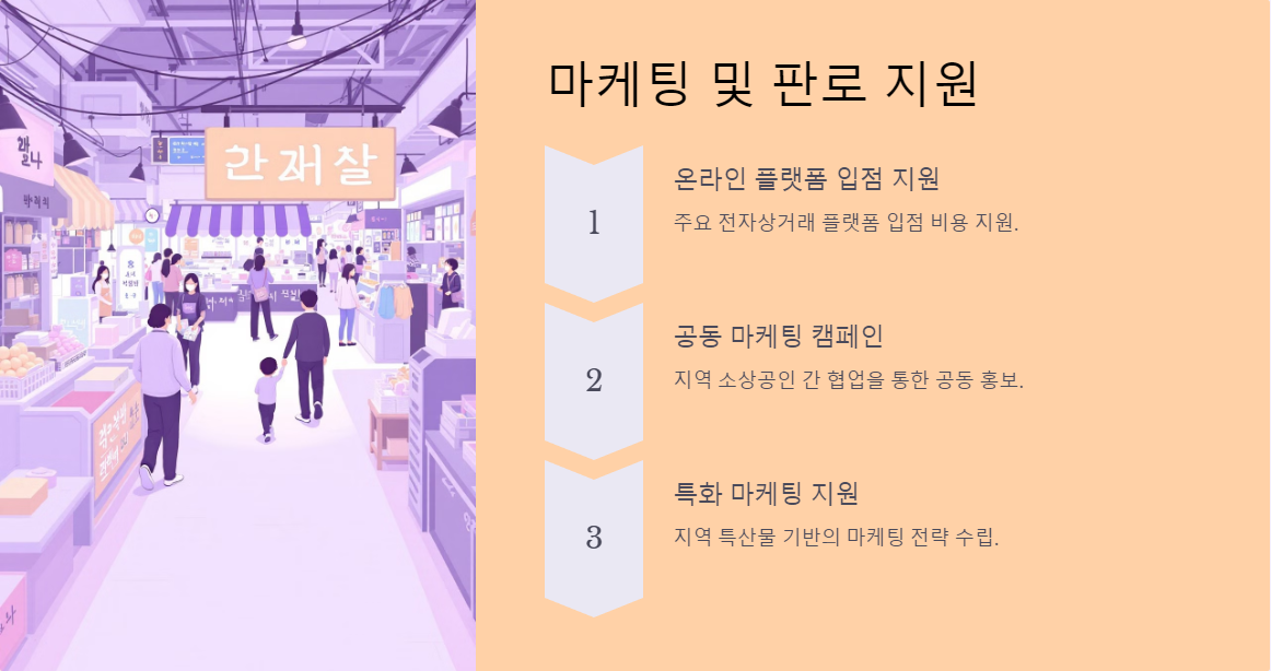 - 온라인 플랫폼 입점 지원: 주요 전자상거래 플랫폼 입점 비용 지원.