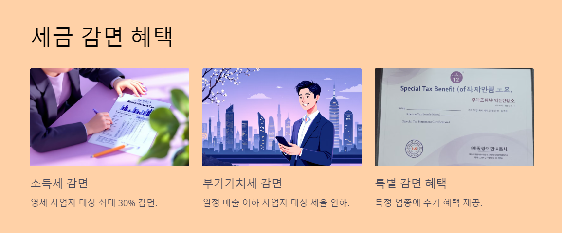 - 소득세 감면: 영세 사업자 대상 최대 30% 감면.