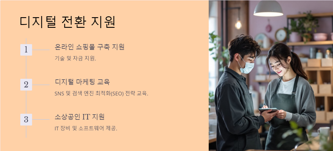디지털 전환은 현대 사업의 필수 요소입니다. 정부는 소상공인이 디지털 기술을 활용하여 경쟁력을 높일 수 있도록 다양한 프로그램을 운영 중입니다.
