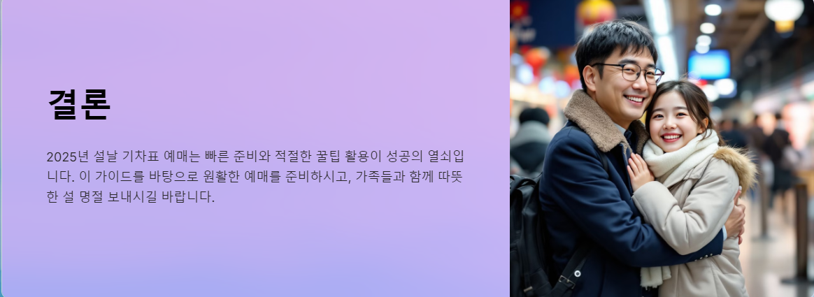 2025년 설날 기차표 예매는 빠른 준비와 적절한 꿀팁 활용이 성공의 열쇠입니다. 이 가이드를 바탕으로 원활한 예매를 준비하시고, 가족들과 함께 따뜻한 설 명절 보내시길 바랍니다.