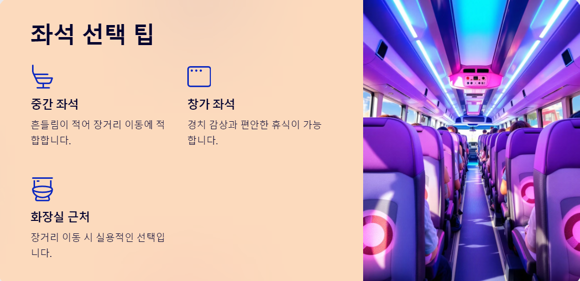 장거리 이동 시에는 화장실과 가까운 좌석이 실용적인 선택이 될 수 있습니다. 또한 야간 이동의 경우 리클라이닝 기능이 있는 좌석을 선택하면 숙면에 큰 도움이 됩니다.