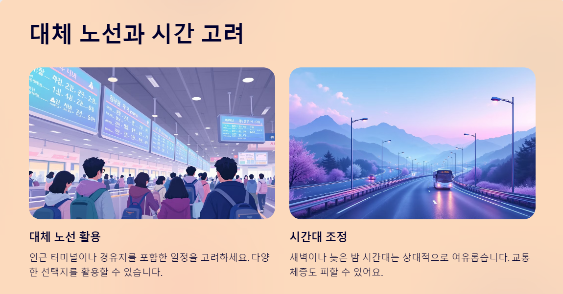 대체 노선이나 경유지를 포함한 일정을 구성하면 더욱 다양한 선택지를 활용할 수 있습니다. 인근 지역의 버스 터미널을 이용하거나, 여러 노선을 결합해 최적의 경로를 설계하는 것도 방법입니다.