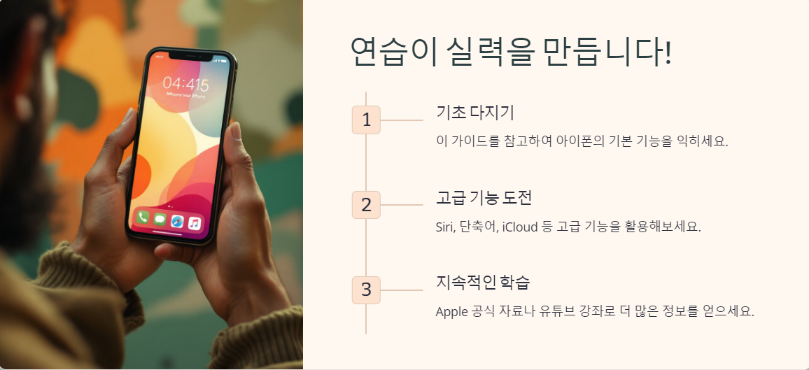 아이폰은 배우는 재미와 활용하는 즐거움을 모두 제공하는 멋진 도구입니다. 기초적인 사용법부터 알아두면 새로운 기능에도 자연스럽게 적응할 수 있어요. 처음에는 느리더라도 천천히 배우며 확실히 익혀 나간다면 아이폰이 얼마나 강력하고 편리한 도구인지 알게 될 것입니다.