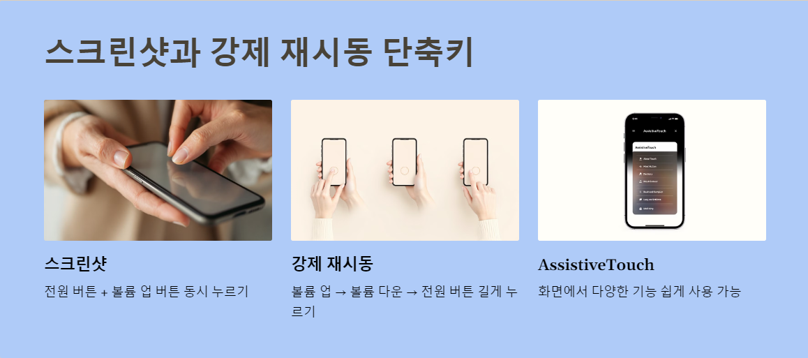 또한, AssistiveTouch를 활성화하면 스크린샷, 홈 버튼 대체, 재시동 등의 기능을 화면에서 손쉽게 사용할 수 있어요. "설정 > 손쉬운 사용 > AssistiveTouch"에서 이 옵션을 활성화할 수 있답니다.