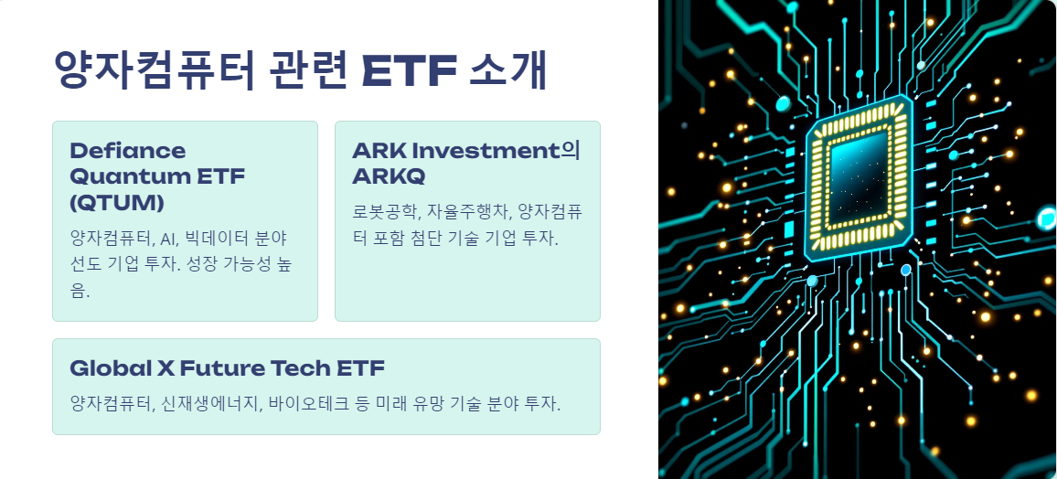 A2. 대표적으로 Defiance Quantum ETF(QTUM), ARKQ, Global X Future Tech ETF 등이 있어요. 이들은 양자컴퓨터뿐만 아니라 AI, 빅데이터, 자율주행 등 첨단 기술에 투자하고 있답니다.