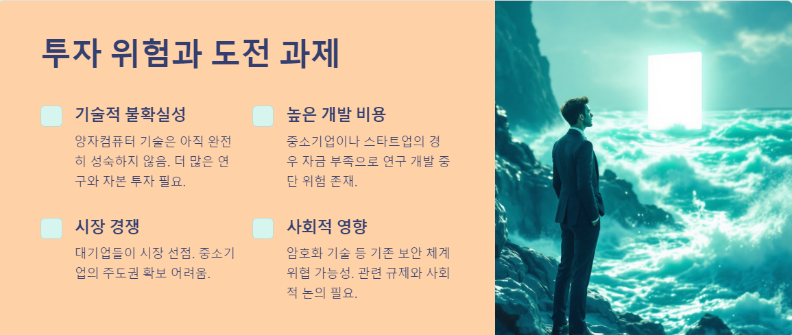 양자컴퓨터는 많은 가능성을 가지고 있지만, 투자에는 여러 도전 과제가 따라요. 가장 큰 문제는 기술적 불확실성이에요. 양자컴퓨터 기술은 아직 완전히 성숙하지 않았고, 대중화되기 위해서는 더 많은 연구와 자본 투자가 필요하답니다. 이는 기술 개발이 예상보다 더 오래 걸릴 가능성을 의미해요.