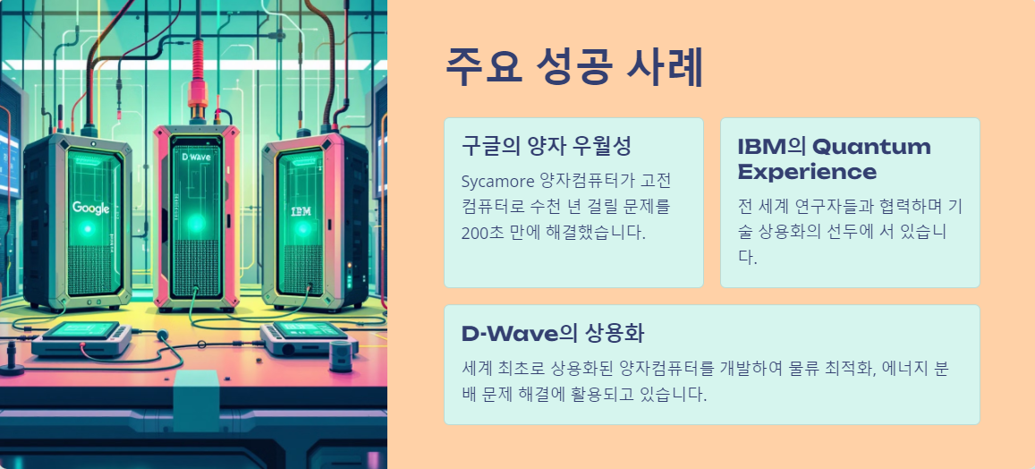 양자컴퓨터 기술로 성공한 주요 사례 중 하나는 구글의 '양자 우월성' 선언이에요. 2019년, 구글은 자사의 Sycamore 양자컴퓨터가 고전 컴퓨터로 수천 년이 걸릴 문제를 200초 만에 해결했다고 발표했어요. 이 발표는 양자컴퓨터의 가능성을 전 세계에 알린 중요한 순간이었답니다.