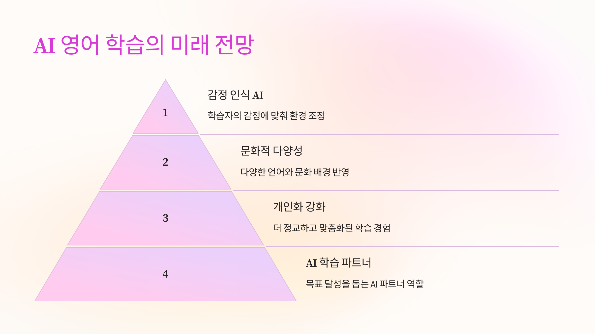 AI 기술이 계속 발전하면서 영어 학습의 미래는 더욱 밝아지고 있어요. 앞으로는 더 정교하고 개인화된 학습 경험을 제공하는 플랫폼이 늘어날 것으로 보이고, 학습자가 실시간으로 AI와 대화하며 학습할 수 있는 기술도 더 발전할 거예요.