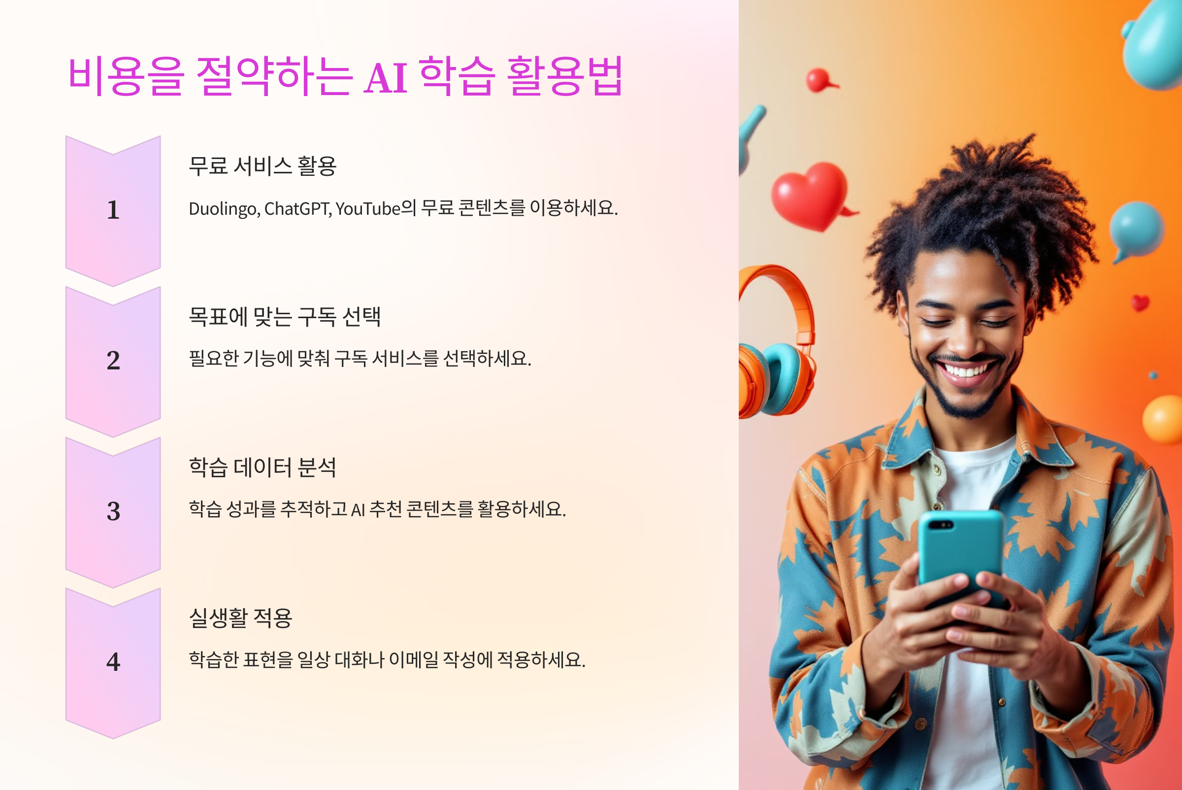 비용을 아끼면서 AI 학습법을 최대한 활용하려면 무료 또는 저렴한 서비스들을 적극 활용하는 것이 중요해요. 앞서 언급한 Duolingo 같은 앱은 기본적으로 무료로 사용할 수 있어요. 또, ChatGPT나 YouTube의 무료 영어 학습 콘텐츠를 이용하면 추가적인 비용 없이 학습의 폭을 넓힐 수 있답니다.
