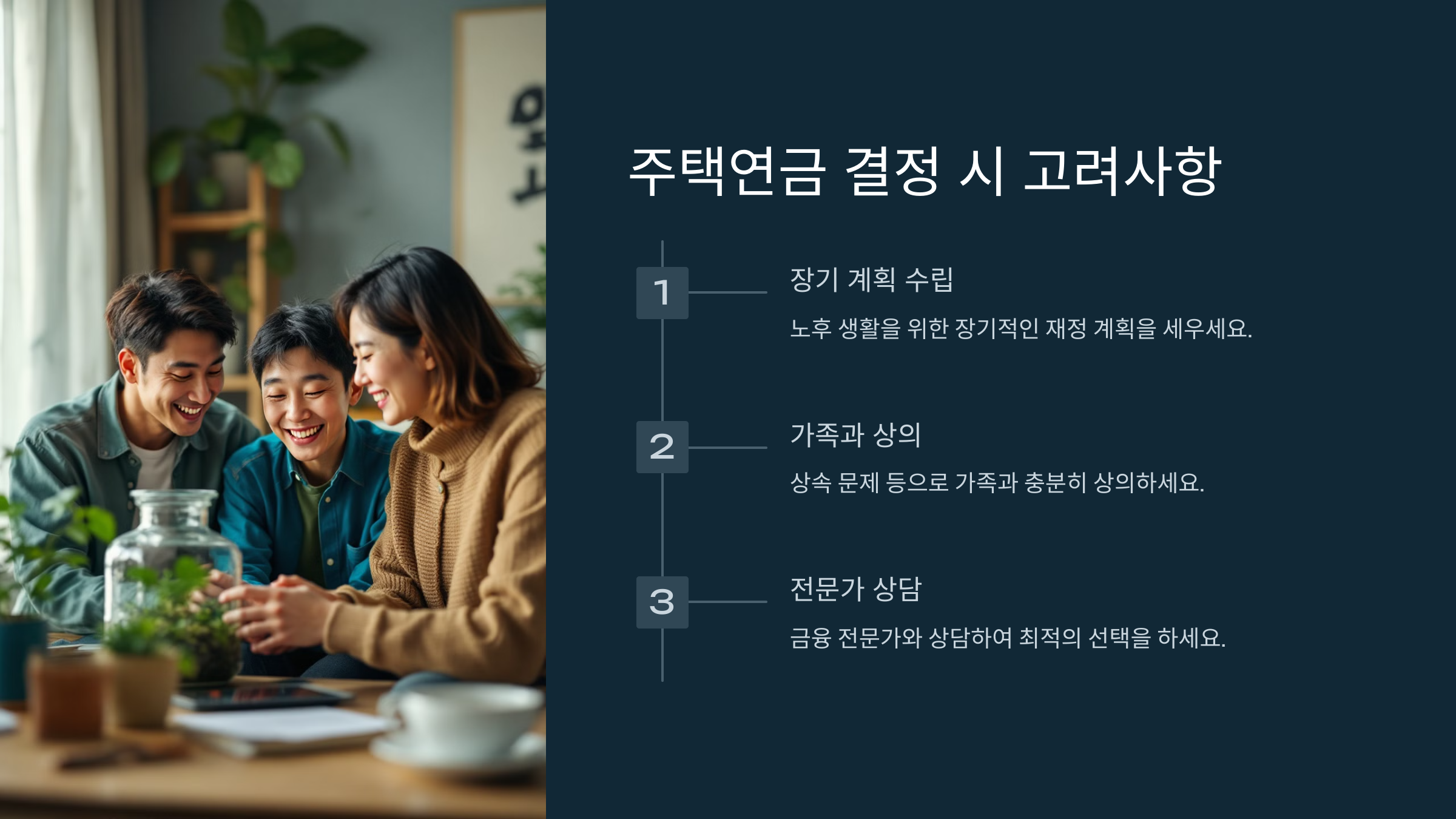 또한, 사망 후 주택 처분 시 남은 대출 원금과 이자를 정산한 후 잔여 금액이 상속인들에게 전달돼요. 따라서 상속인과 충분히 협의하고 가입 여부를 결정하는 것이 좋아요.