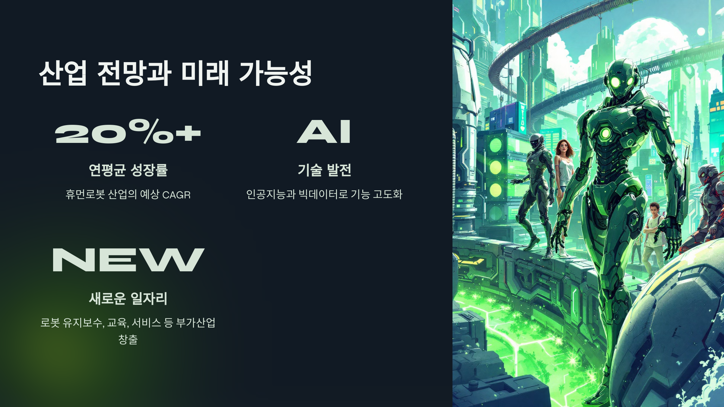 휴먼로봇 시장은 앞으로도 꾸준히 성장할 것으로 예상돼요. 글로벌 리서치 기관들에 따르면, 휴먼로봇 산업은 연평균 성장률(CAGR)이 20% 이상에 이를 것으로 전망된다고 해요. 이는 기술 발전, 고령화, 그리고 자동화 수요 증가가 주요 동력으로 작용하기 때문이에요.