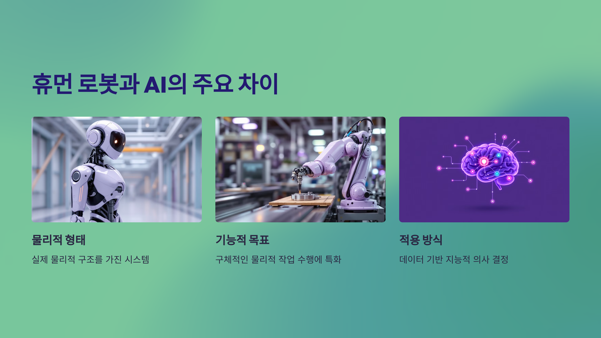 휴먼 로봇과 AI의 가장 큰 차이는 물리적 형태와 기능적 목표에 있어요. 휴먼 로봇은 주로 물리적인 활동을 수행하기 위해 설계된 반면, AI는 데이터를 처리하고 의사 결정을 내리는 데 중점을 둔 소프트웨어 시스템이에요.