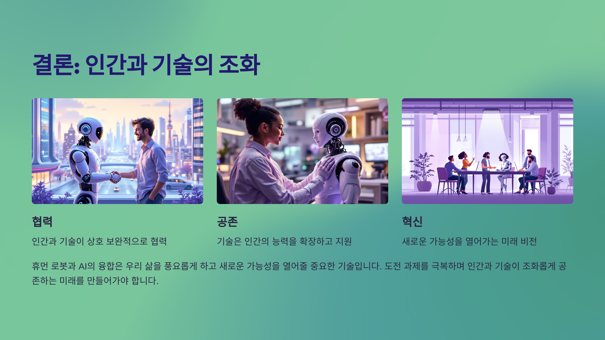 결론적으로, 휴먼 로봇과 AI의 융합은 인간의 삶을 보다 풍요롭게 하고, 새로운 가능성을 열어줄 중요한 기술로 자리 잡고 있어요. 이 둘의 협력은 무궁무진한 가능성을 지니고 있어요.