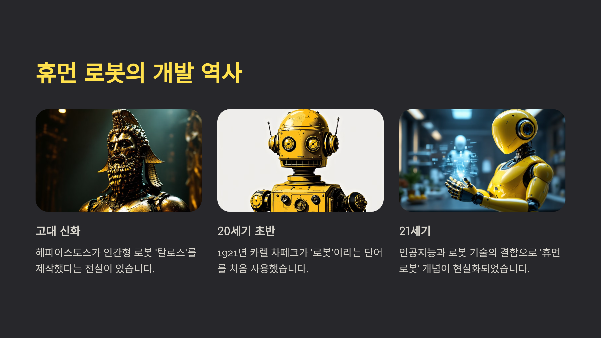 휴먼 로봇의 기원은 고대 신화 속 자동화 기계 이야기로 거슬러 올라가요. 고대 그리스 신화에서는 헤파이스토스가 인간형 로봇 '탈로스'를 제작했다는 전설이 있죠. 이처럼 인간은 오래전부터 스스로를 닮은 기계를 만들고자 하는 욕망을 품고 있었어요.