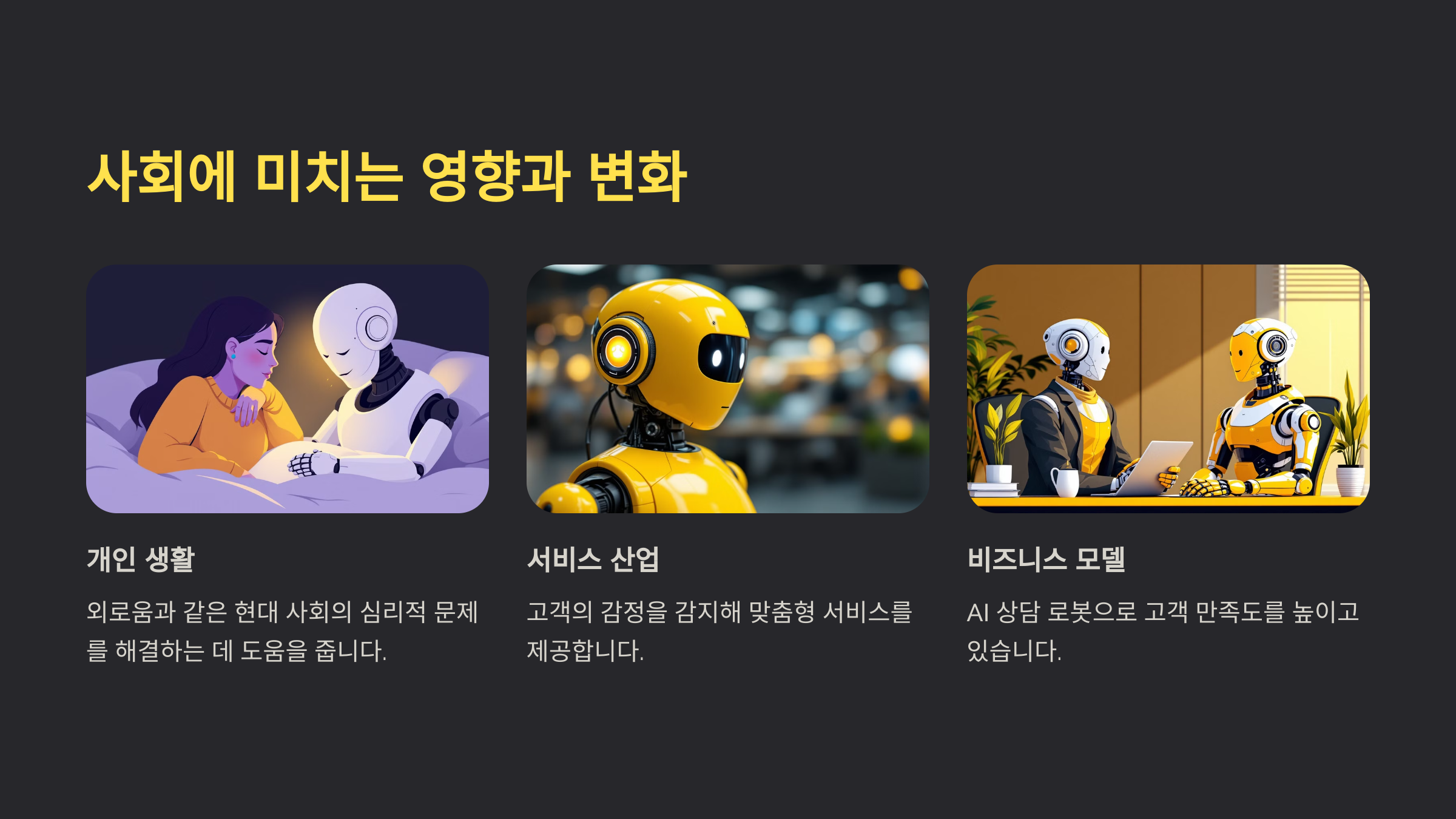 이처럼 감정 AI는 기술과 인간의 심리적 연결을 만들어내는 혁신적인 도구예요. 앞으로 더욱 발전하며 교육, 치료, 상담 등 다양한 분야에서 활용될 전망이에요. 이제 남은 나머지 부분을 이어서 자동으로 출력할게요!