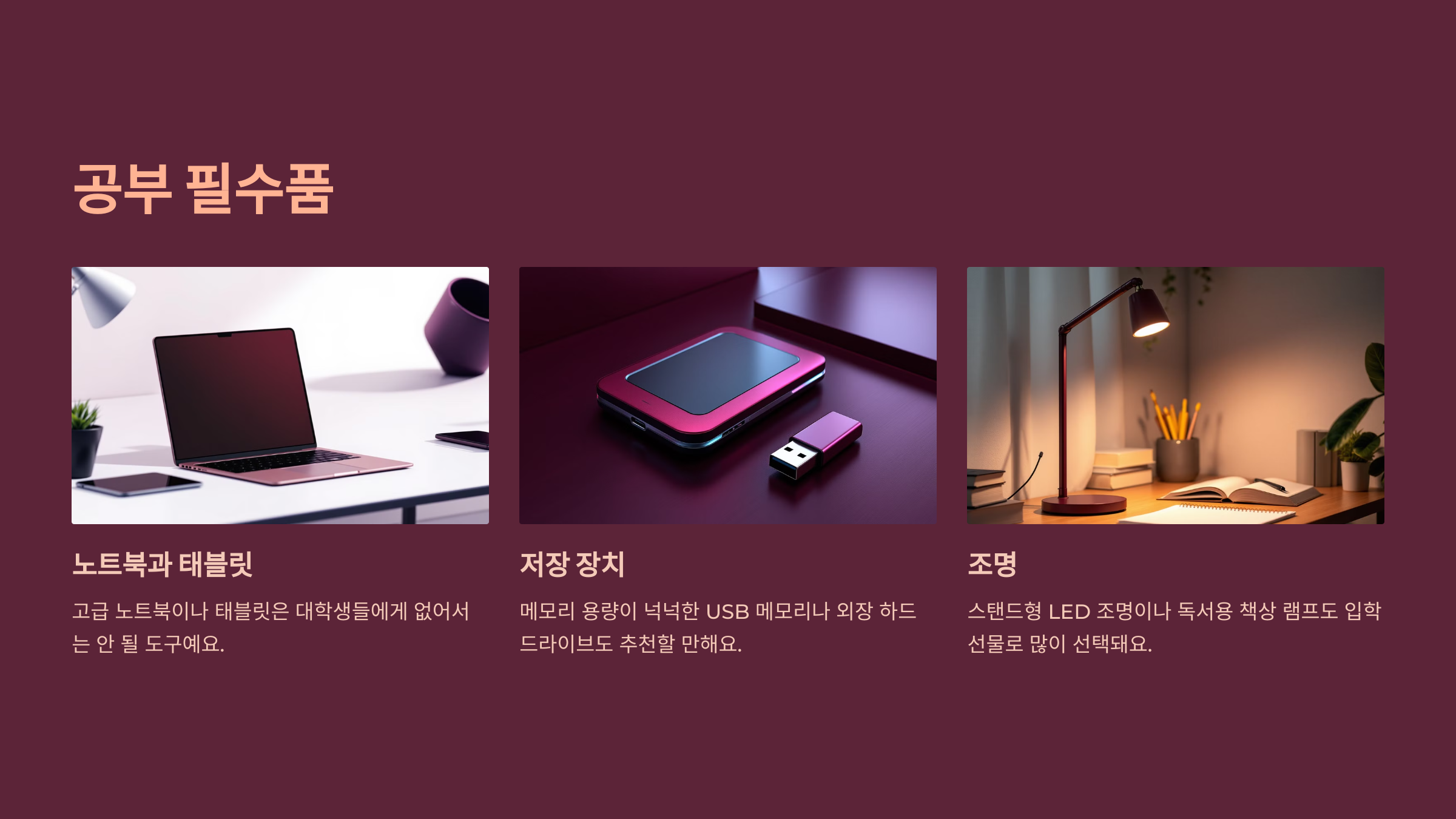 대학생활에서 공부는 여전히 중요한 부분을 차지하죠. 그래서 학업에 도움을 줄 수 있는 필수품들을 선물로 준비하는 것도 좋은 선택이에요. 고급 노트북이나 태블릿은 대학생들에게 없어서는 안 될 도구예요. 특히 강의 노트 필기나 자료 검색, 과제 작성에 유용하죠.