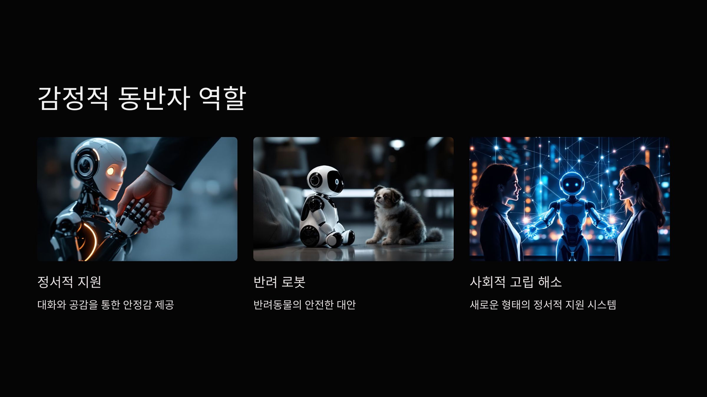 예를 들어, 반려동물을 기르는 것이 어렵거나 알레르기 문제가 있는 사람들에게 로봇은 안전하고 유익한 대안이 될 수 있어요. 로봇은 주인의 감정을 인식하고, 적절히 반응하며, 서로 긍정적인 상호작용을 만들어갈 수 있어요.