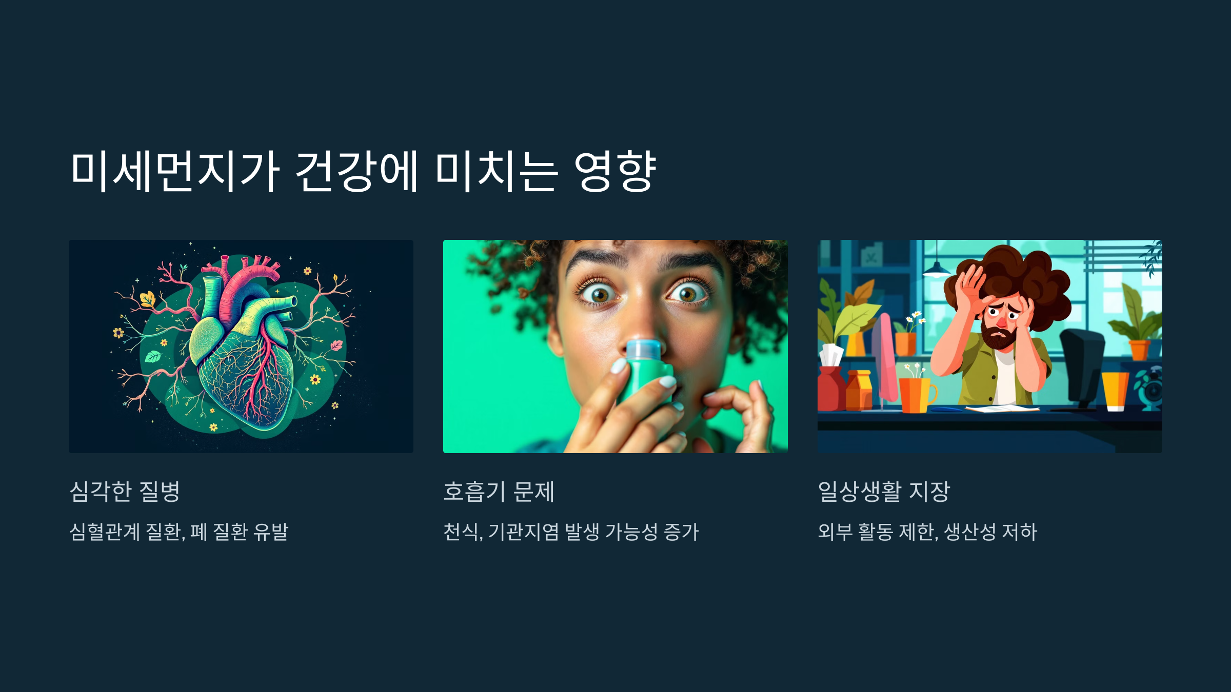 미세먼지는 우리의 건강에 다양한 영향을 미칠 수 있어요. 미세먼지에 장시간 노출되면 호흡기 질환, 천식, 기관지염과 같은 질환이 발생할 수 있어요. 초미세먼지는 더 작은 크기 때문에 폐 속 깊이 침투하거나 혈액으로 흡수될 가능성이 있어 심각한 질병을 유발할 수 있어요.
