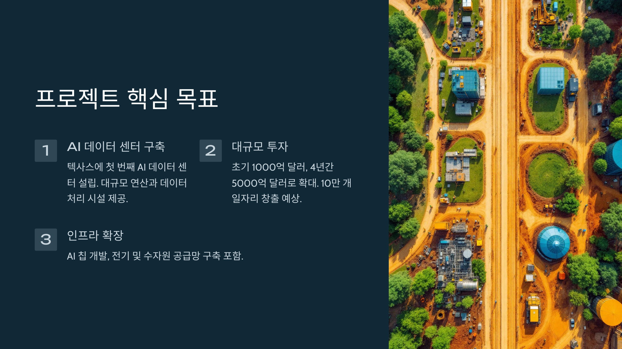 - 대규모 투자 계획: 초기 1000억 달러를 시작으로, 4년간 5000억 달러 규모로 확대.