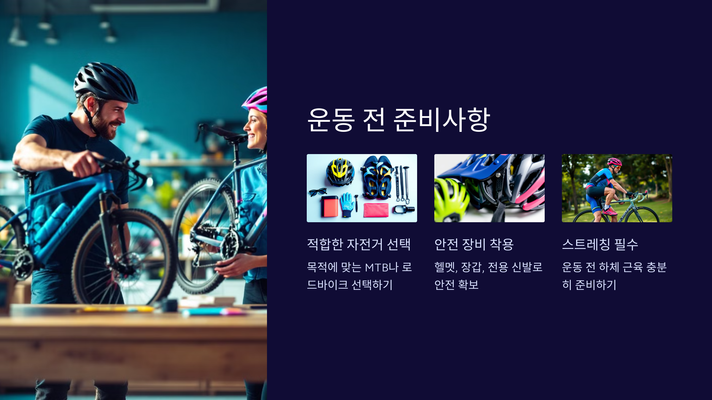 자전거 운동을 효과적으로 즐기려면 적절한 준비가 필요해요. 우선, 자신에게 맞는 자전거를 선택하는 것이 중요해요. 산악자전거(MTB)와 로드바이크는 각각 다른 주행 환경에 적합하므로, 운동 목표와 지역에 따라 선택하면 돼요. 그리고 자신의 키와 체형에 맞게 안장 높이를 조정해야 허리와 무릎에 부담이 가지 않아요.