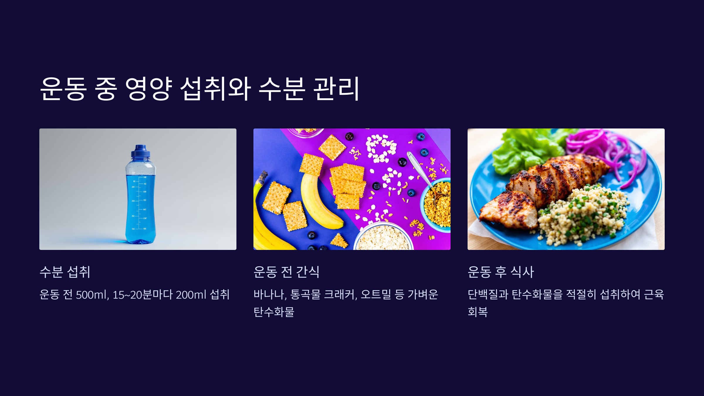 운동 전에는 에너지를 보충할 수 있는 가벼운 탄수화물 위주의 간식을 섭취해보세요. 바나나, 통곡물 크래커, 오트밀 같은 음식이 적합하답니다. 운동 후에는 단백질과 탄수화물을 적절히 섭취해 근육 회복을 돕고, 에너지 소모를 보충하는 것이 중요해요.