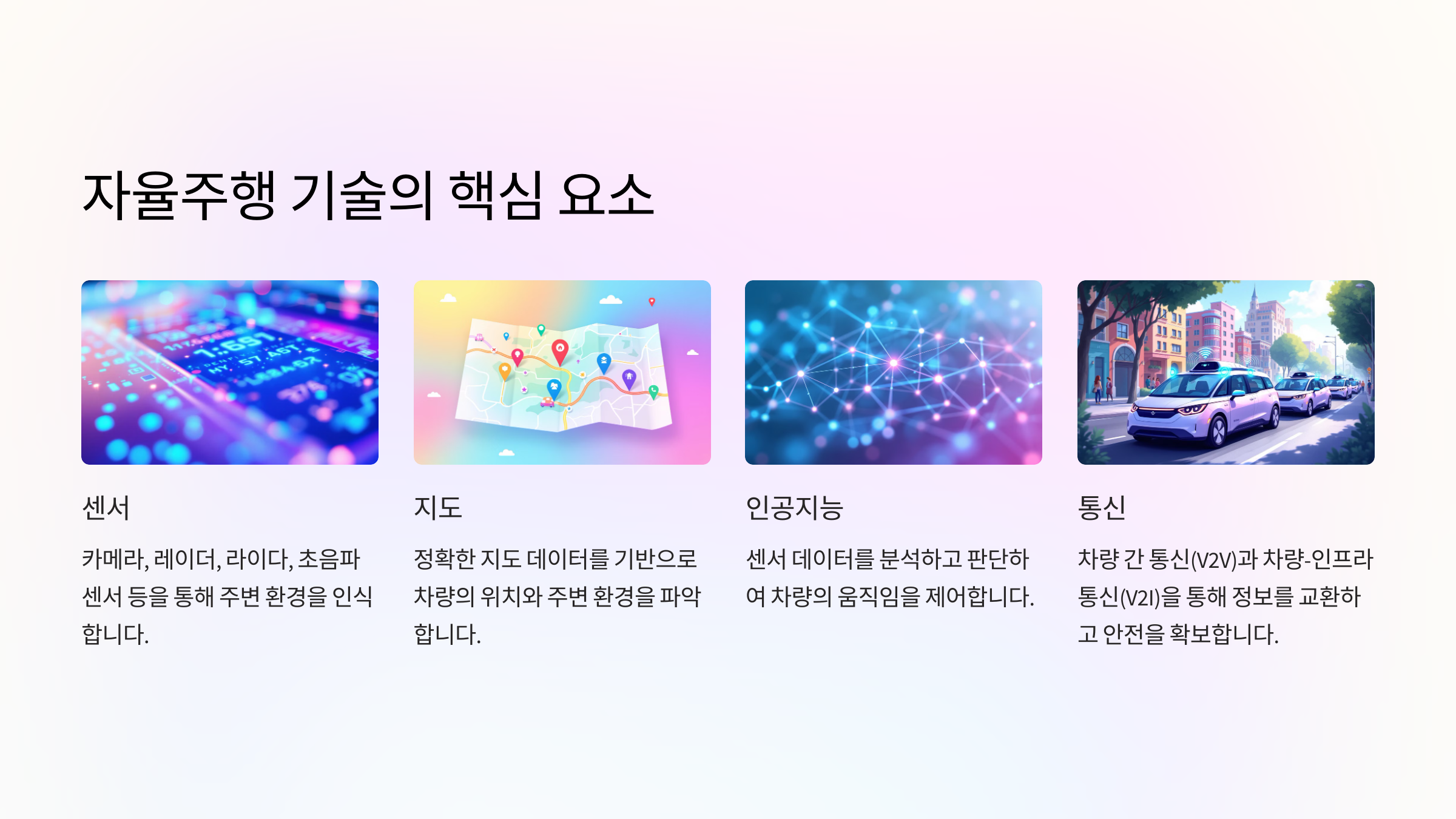 자율주행 기술이 발전하면서 도로에서 자동차들이 서로 통신하고, 실시간 데이터를 분석해 더욱 안전하고 효율적인 주행을 할 수 있게 될 거예요. 🚘💡