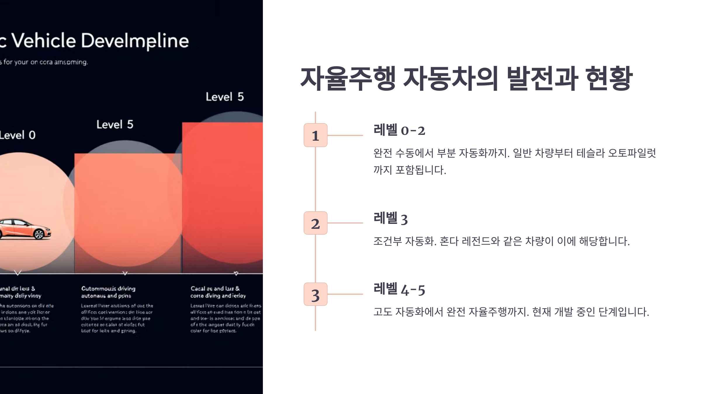 자율주행 기술은 20세기 후반부터 연구되었지만, 본격적인 상용화 단계에 접어든 것은 최근 몇 년 사이예요. 현재 자율주행 자동차는 레벨 0(완전 수동)부터 레벨 5(완전 자율)까지 총 6단계로 나뉘어요.