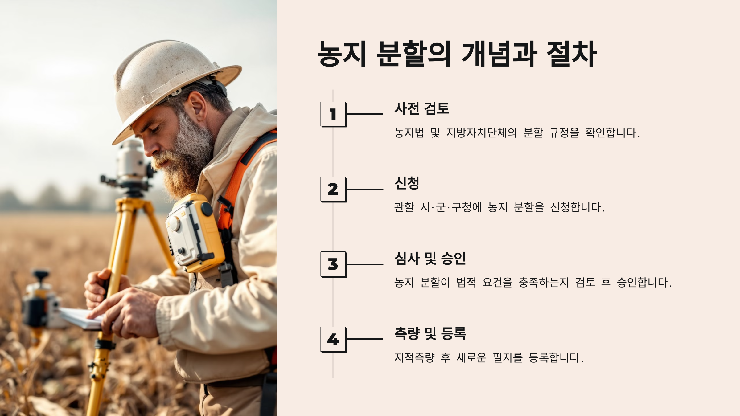 농지 분할을 위해서는 먼저 해당 지역의 '농지법' 및 '국토의 계획 및 이용에 관한 법률'을 확인해야 해요. 모든 농지가 자유롭게 분할될 수 있는 것은 아니며, 일정한 요건을 충족해야 해요.