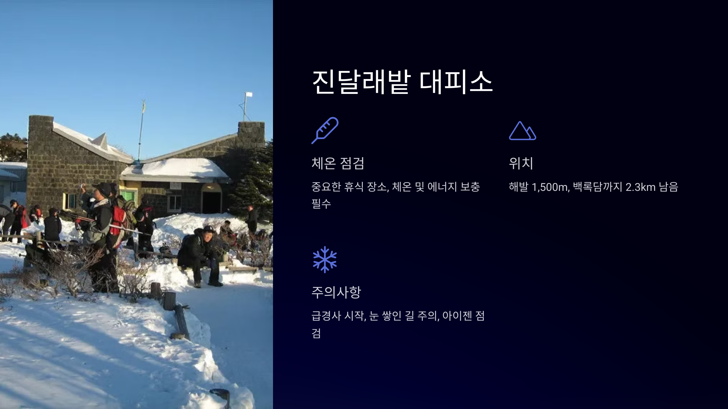 진달래밭 대피소는 성판악 코스에서 가장 중요한 휴식 장소예요. 해발 1,500m 지점에 위치하며, 정상인 백록담까지는 약 2.3km 남아 있어요. 겨울철에는 이곳에서 반드시 체온을 점검하고, 에너지를 보충하는 것이 중요해요. 🍵