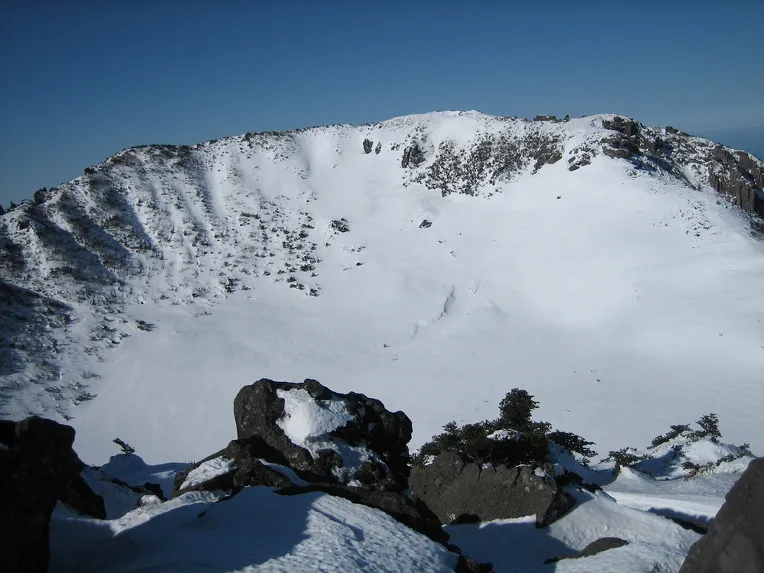 드디어 한라산의 정상, 백록담에 도착했어요! 해발 1,950m에 위치한 백록담은 겨울철에는 하얀 눈으로 덮여 신비로운 분위기를 자아내요. 이곳에서 바라보는 제주의 전경은 그야말로 장관이에요. 📸