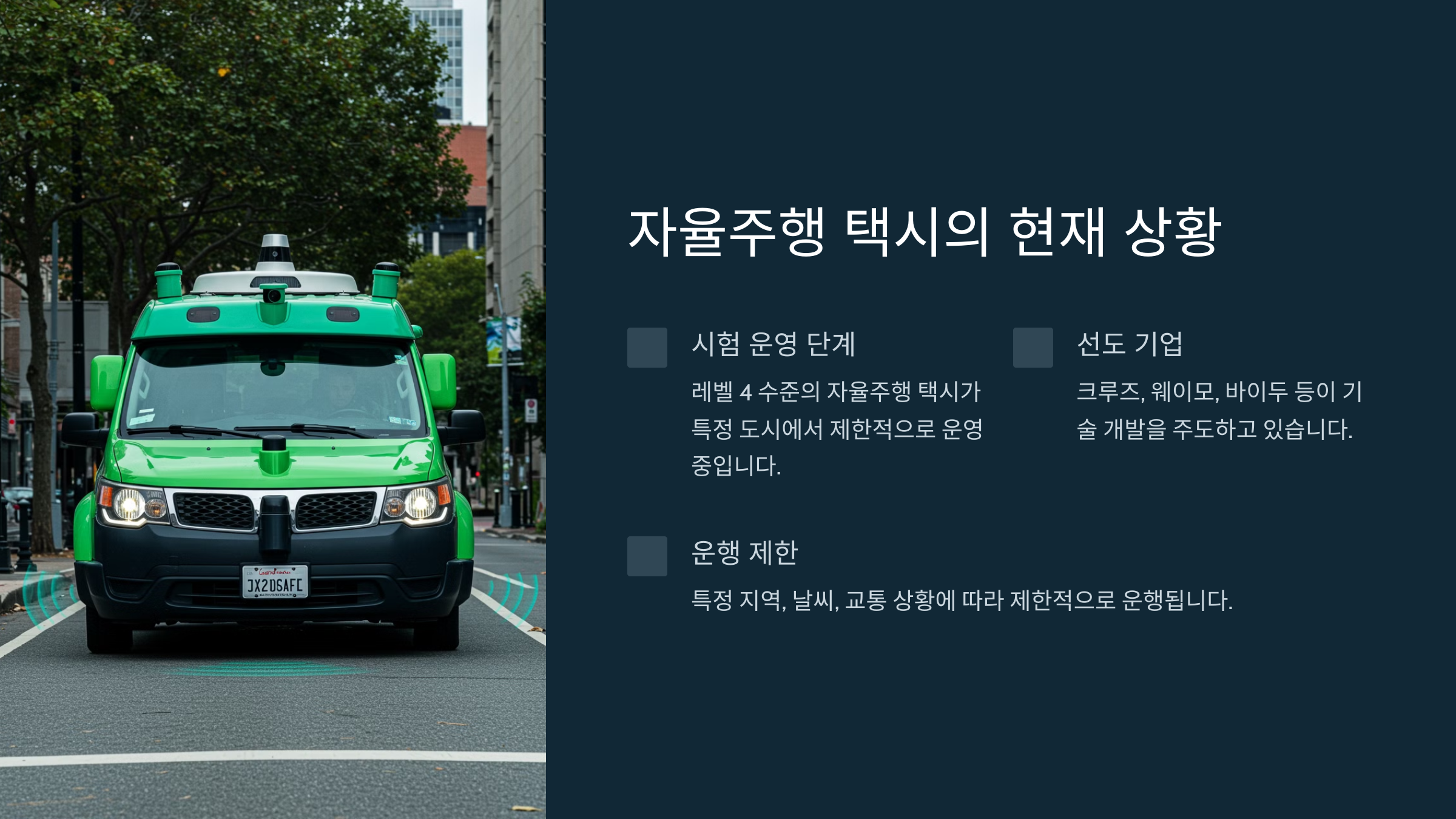 현재 전 세계적으로 자율주행 택시는 시험 운영 단계를 거치고 있어요. 완전한 자율주행(레벨 5)에 도달한 차량은 아직 없지만, 특정 도시에서는 제한된 조건에서 레벨 4 수준의 자율주행 택시 서비스가 운영 중이에요.