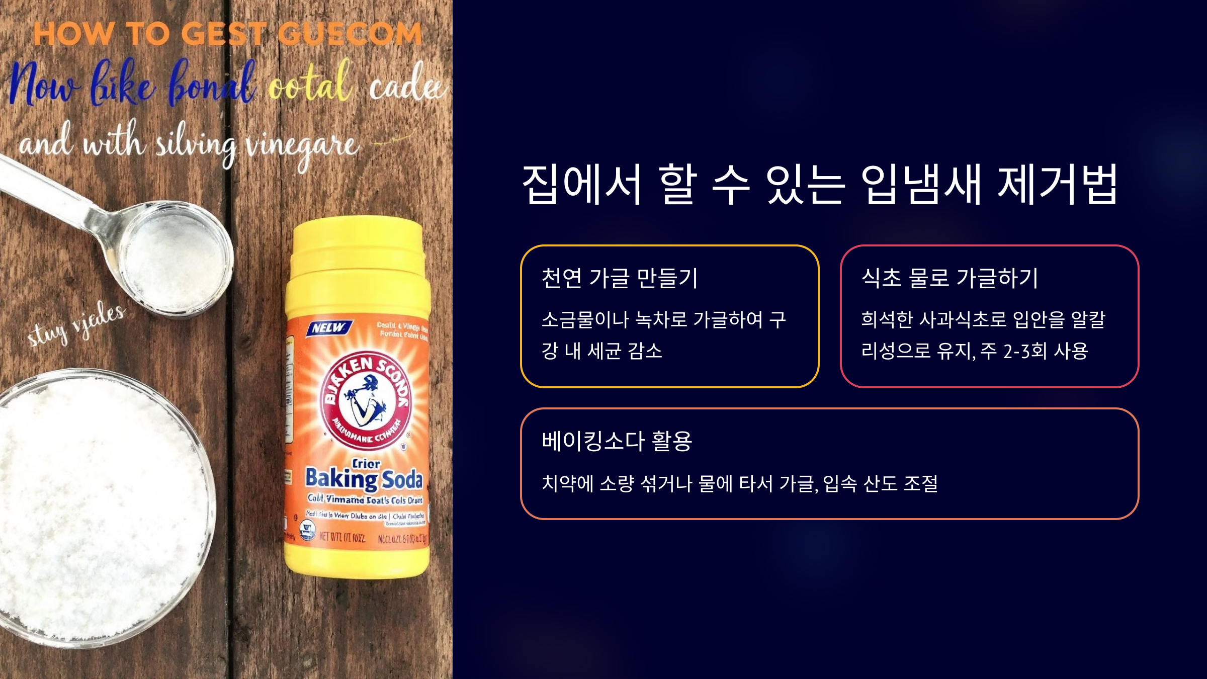 3️⃣ 베이킹소다 활용 🧂 베이킹소다는 입속 산도를 조절해 주고 세균을 제거하는 데 도움을 줘요. 치약에 소량 섞어서 양치하거나 물에 타서 가글하면 입냄새 예방에 효과적이에요.