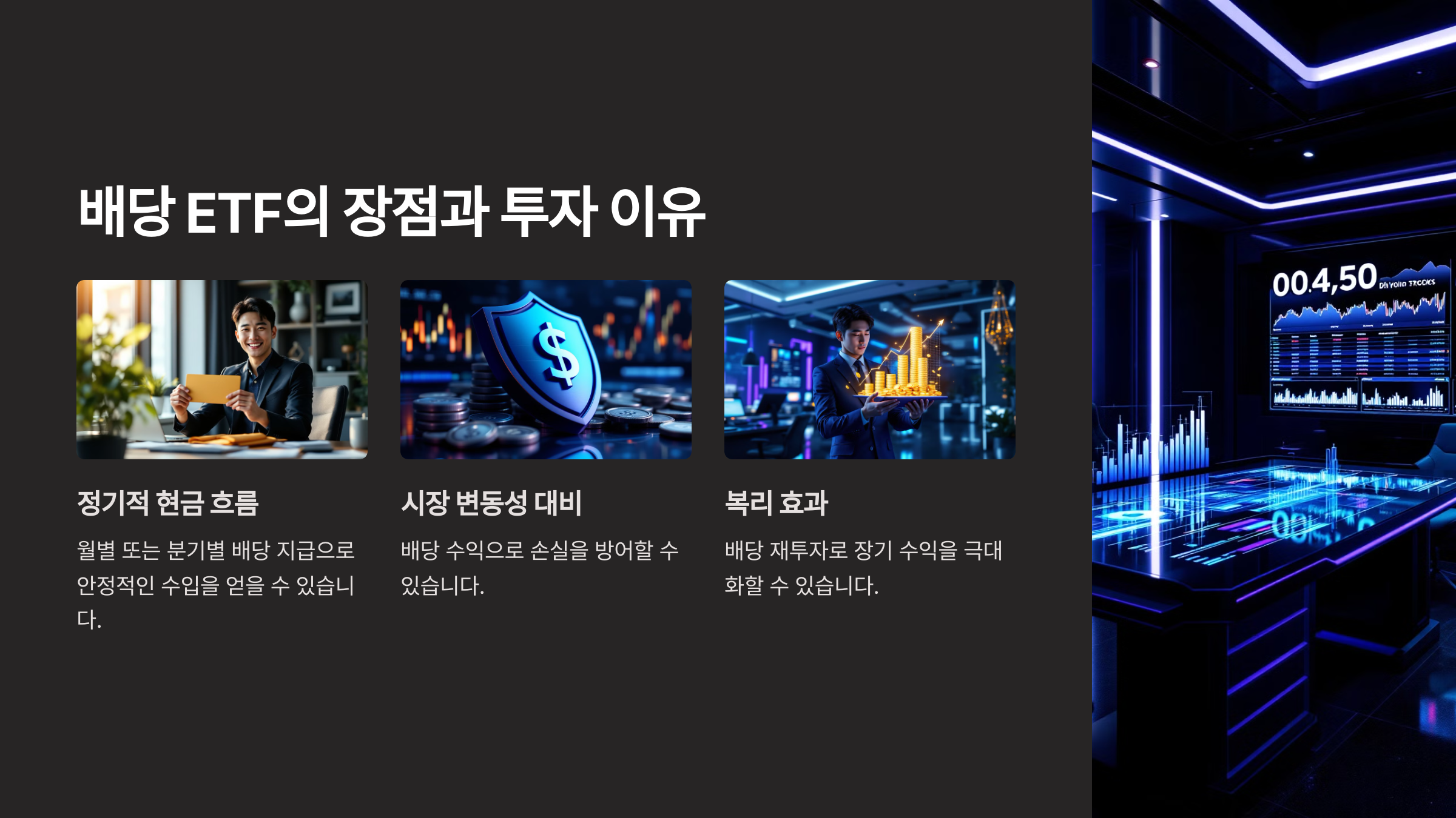 배당 ETF에 투자하면 안정적인 수익을 기대할 수 있어요. 특히 장기 투자 시 복리 효과까지 누릴 수 있어 더욱 매력적이죠. 💰