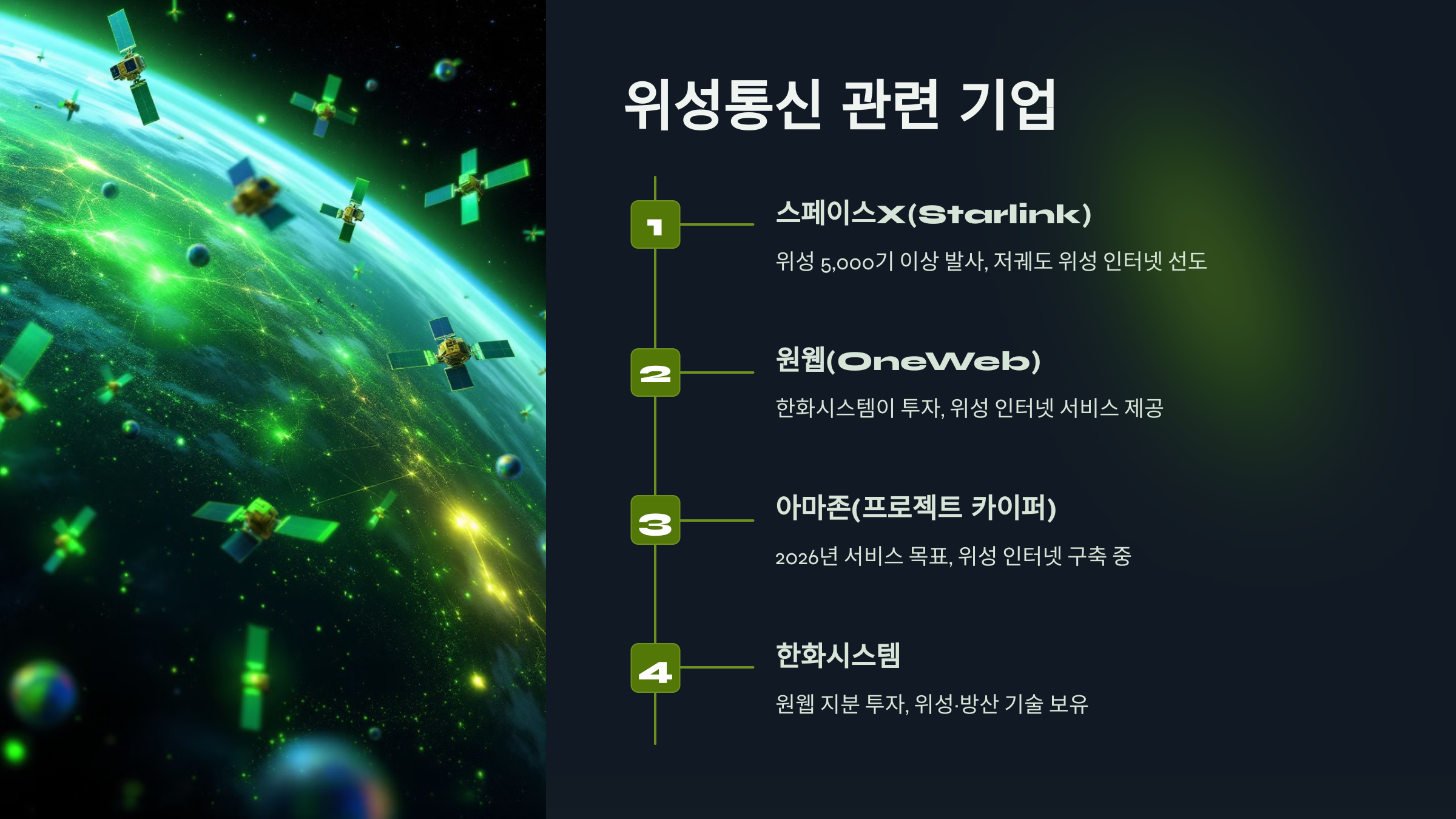 국내에서도 한화시스템, KT SAT 등이 위성통신 사업을 확대하고 있어요. 특히 한화시스템은 미국 위성기업 원웹과 협력해 저궤도 위성 시장에 적극적으로 진출하고 있죠.