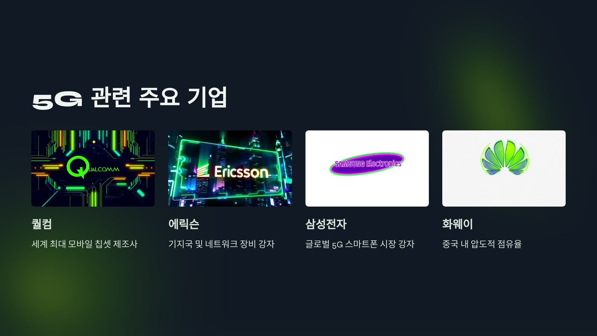 A2. 퀄컴(5G 칩셋), 삼성전자(5G 스마트폰·네트워크 장비), 에릭슨·노키아(5G 기지국) 등이 주요 기업이에요. 글로벌 시장에서 5G 네트워크 구축이 활발해지면서 이들 기업의 성장성이 높아요.