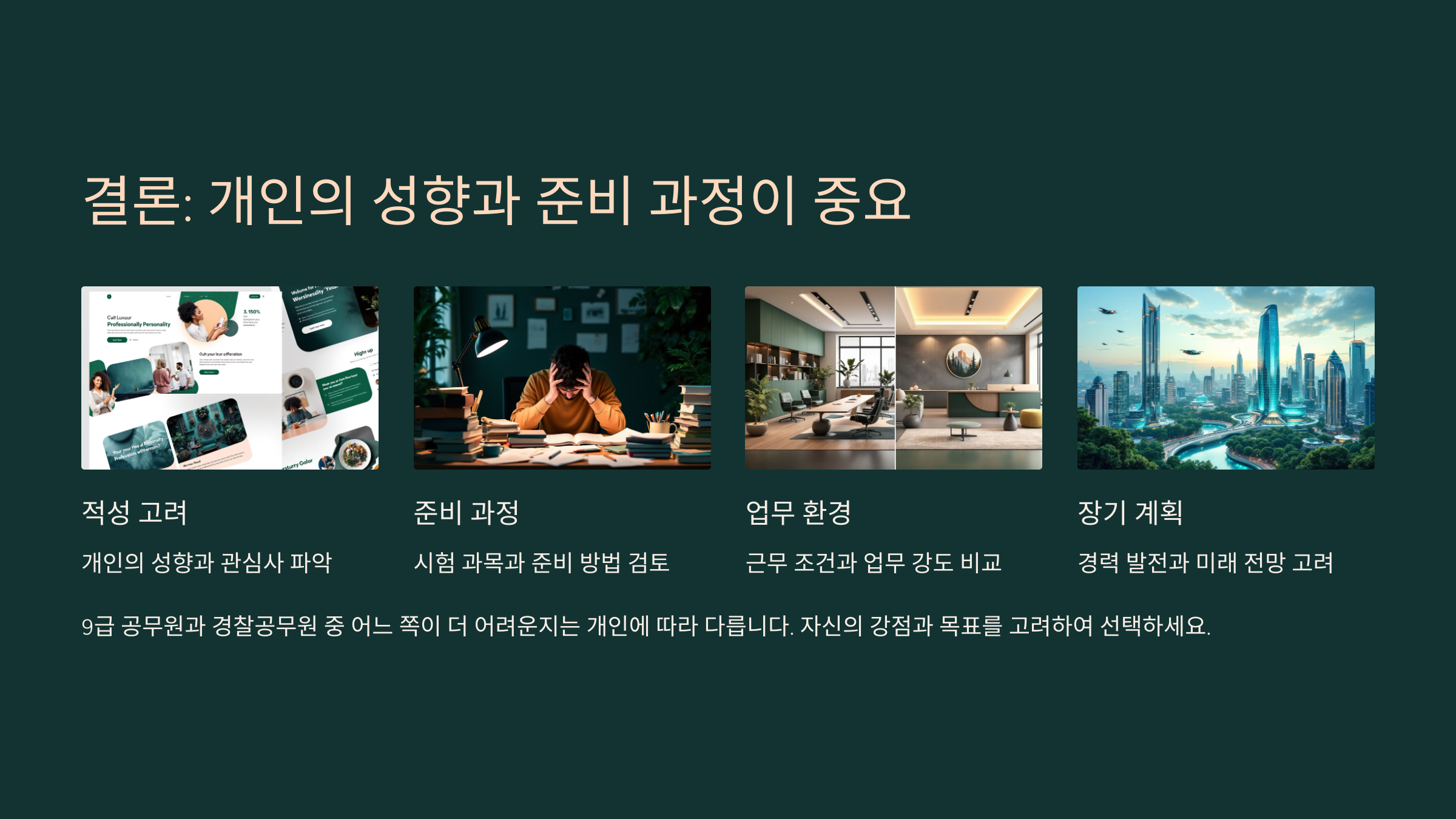 ⚖️ 결론적으로, 업무 강도와 위험 부담은 경찰공무원이 훨씬 높아요. 따라서 단순히 공무원이 되고 싶다면 9급 공무원이 더 나을 수 있지만, 도전적이고 사회에 기여하는 직업을 원한다면 경찰공무원이 적합할 수 있어요.