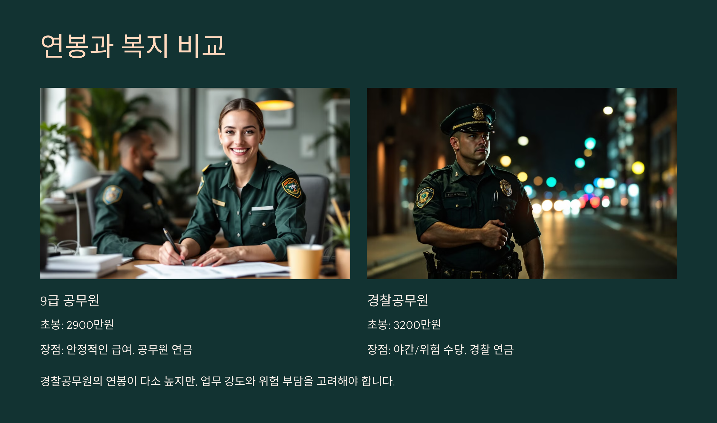 📌 경찰공무원은 위험수당과 야간 근무 수당이 추가되기 때문에 9급 공무원보다 연봉이 높아요. 하지만 근무 강도가 더 높다는 점을 고려해야 해요.