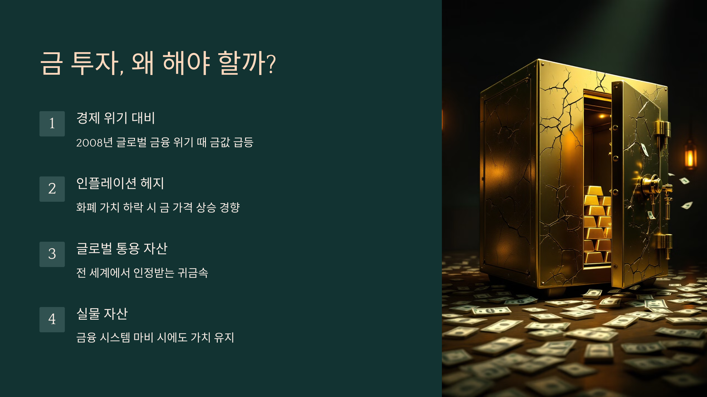 금 투자는 여러 이유에서 매력적인 선택지가 될 수 있어요. 첫째, 금은 경제 위기 때마다 강한 상승세를 보였어요. 2008년 글로벌 금융 위기 때도 금값은 급등하며 투자자들에게 안전자산으로서의 역할을 입증했죠.