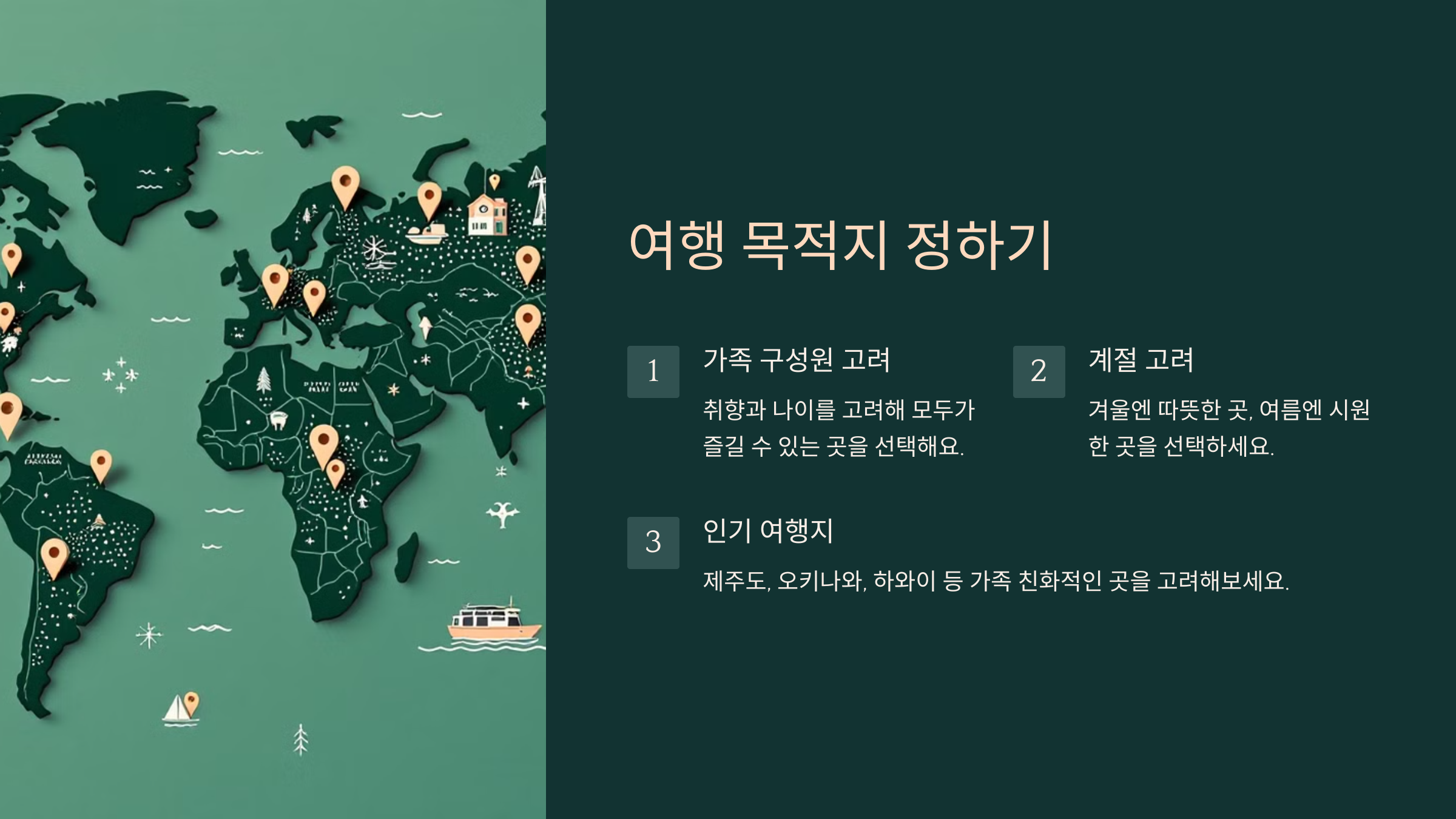 가족 여행의 첫 단계는 바로 목적지를 정하는 거예요! 여행지를 정할 때는 가족 구성원의 취향과 나이를 고려해야 해요. 아이가 있는 가족이라면 놀이공원이나 자연 친화적인 곳이 좋고, 어른이 많다면 문화유적이나 휴양지가 더 적합할 수 있어요.