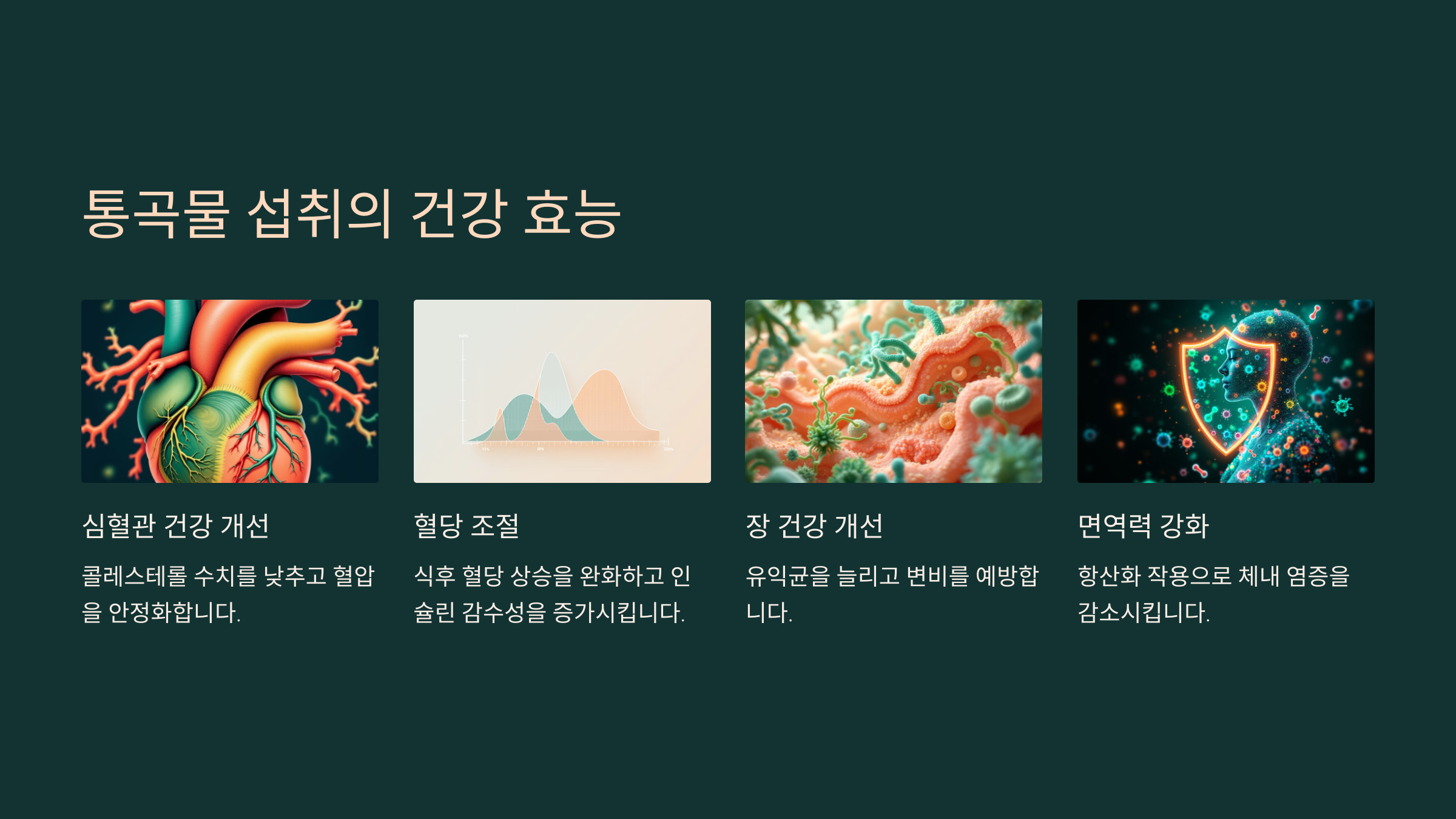🌿 통곡물을 꾸준히 섭취하면 다양한 건강상의 이점을 얻을 수 있어요. 특히, 심혈관 건강, 혈당 조절, 면역력 강화 등에 효과적이에요.