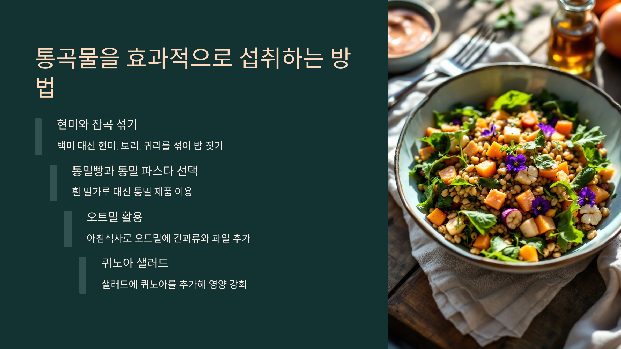 🥣 다양한 요리에 활용하면 통곡물을 더욱 맛있게 즐길 수 있어요. 오트밀을 아침식사로 먹거나, 샐러드에 퀴노아를 추가하는 것도 좋은 방법이에요.